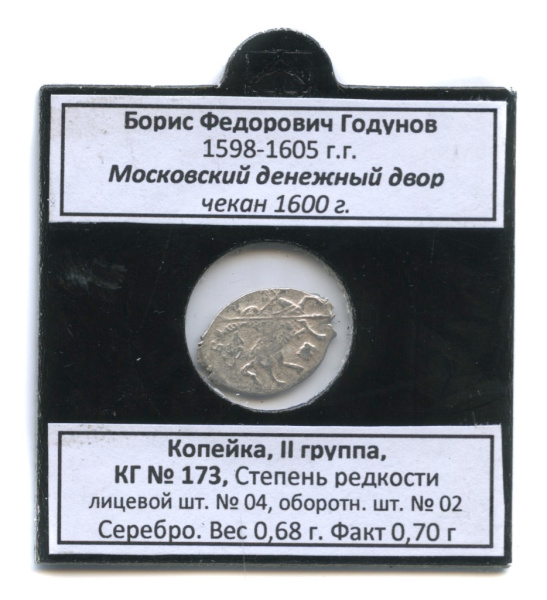 Копейка 1600. В холдере. Борис Федорович Годунов (1598−1605 гг.) МДД, КГ № 173, степень редкости. Лицевой шт. № 04, оборотн. шт. № 2. Серебро. Вес 0,6…