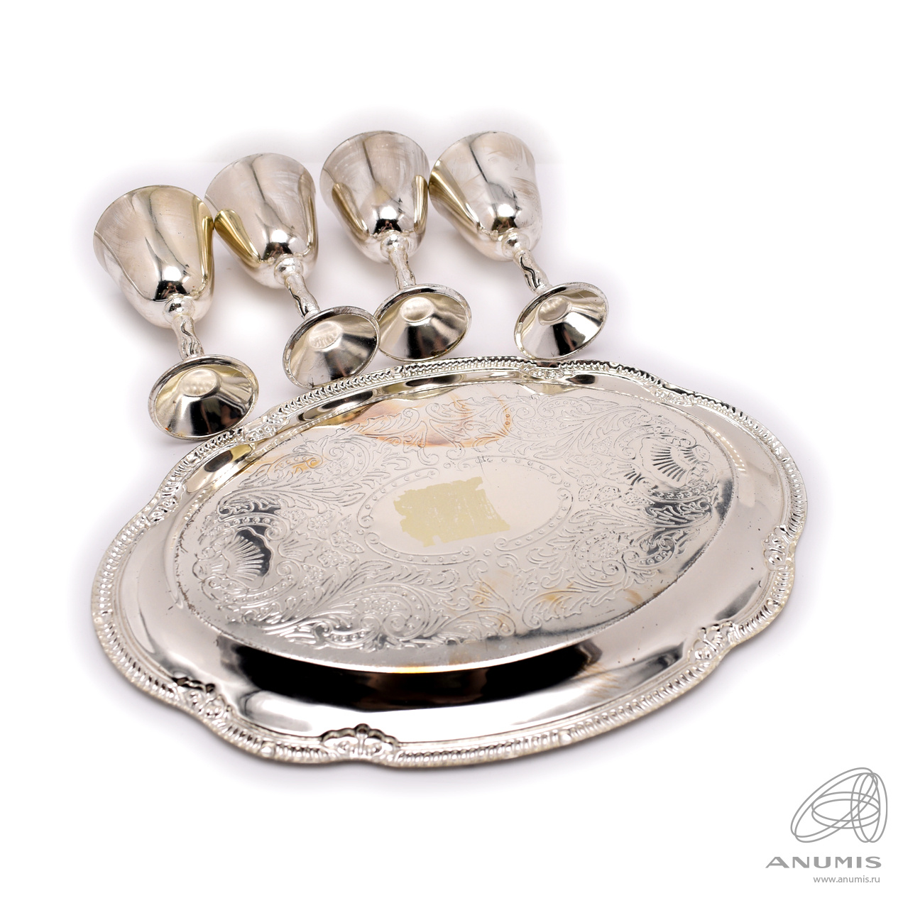 Лот рюмок с подносом. 5 шт. Рюмка 10 см, поднос 24×17 см. Мельхиор