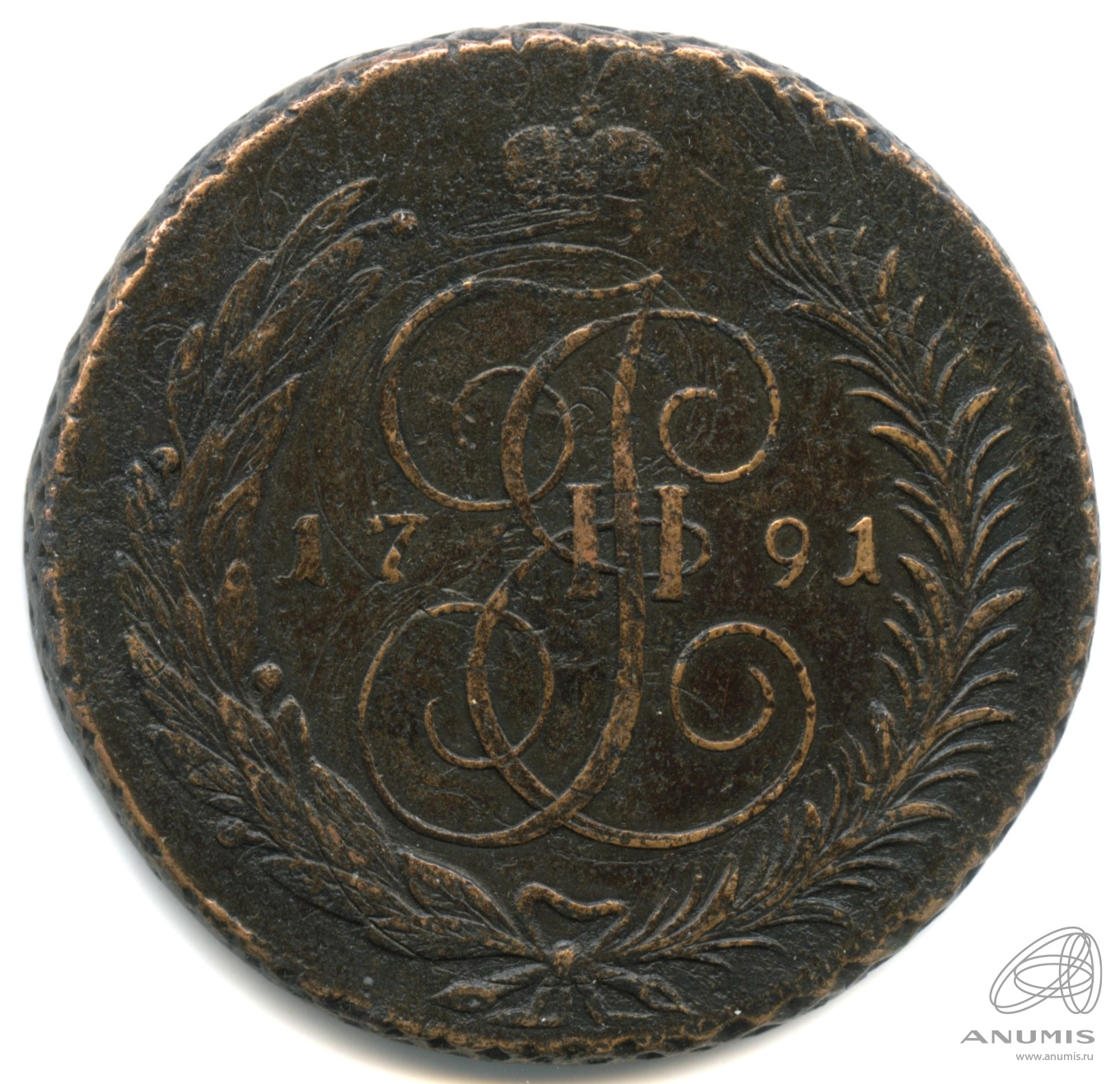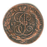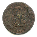 Монета регулярного выпуска: 5 копеек 1791 года «Вензель императрицы Екатерины II Великой. Орел 1789 г. Екатеринбург». 5 копеек 1763 — 1796 гг. Российская Империя: Екатерина II (1762 — 1796). Монетный двор: Екатеринбургская монета, г. Екатеринбург. Медь, 51 г, ø 42−43 мм, Гурт: Узор. Тираж: 23738820 шт.