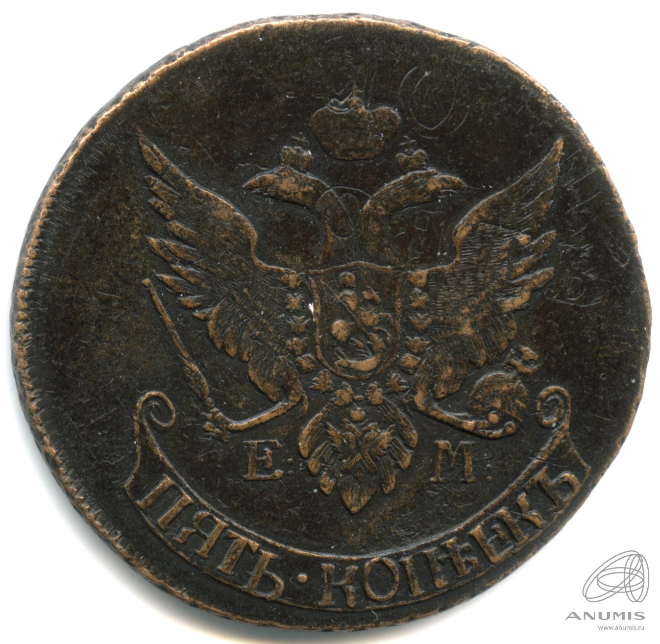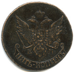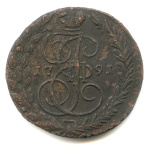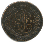 5 копеек — Вензель императрицы Екатерины II Великой. Орел 1789 г. Екатеринбург 1791 ЕМ. Образца Павловского перечекана. Нижегородский тип. После букв Е и М двоеточия. Чекан на Временном монетном Дворе Нижнего Новгорода в 1797 году. Классическая редкость р