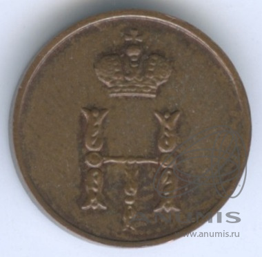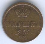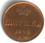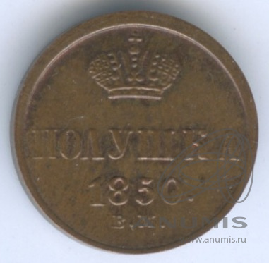 Монета регулярного выпуска: Полушка (¼ копейки) 1850 года «Вензель Николая I». Полушка 1849 — 1867 гг. Российская Империя: Николай I (1825 — 1855). Монетный двор: Mennica Warszawska/Варшавская Монета, г. Варшава, Польша. Медь, 1 г, ø 14−15 мм, Гурт: Гладкий.