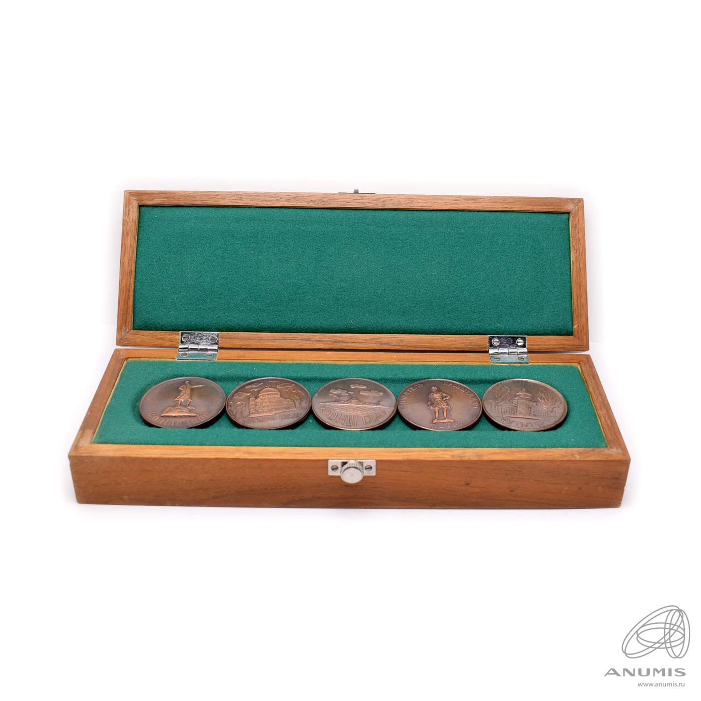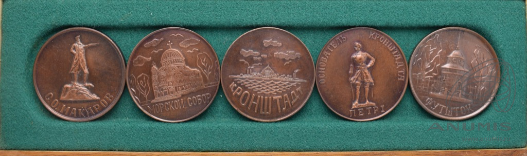 Набор памятных настольных медалей в сувенирном деревянном футляре «300-летие Кронштадта» 5 шт. Br. редкий