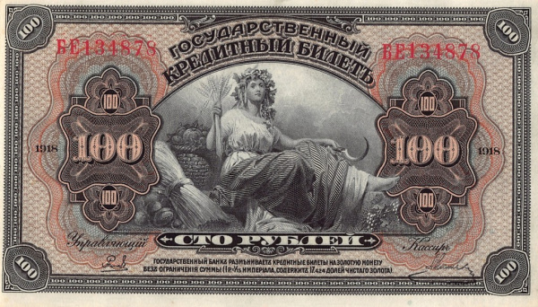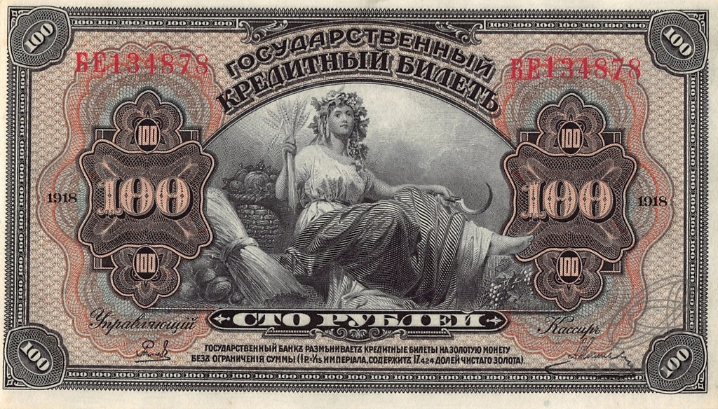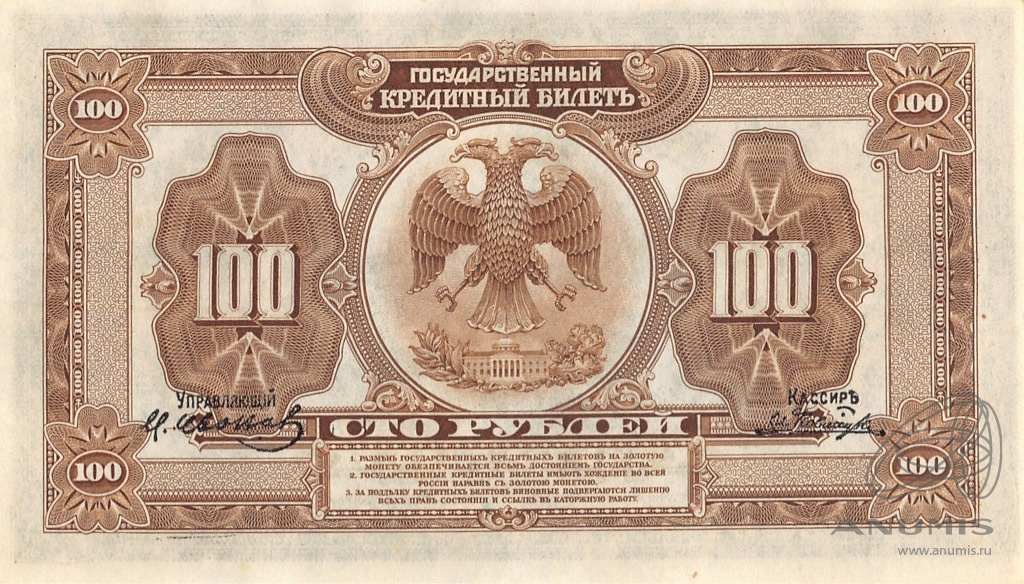 100 рублей Временное Правительство Дальнего Востока. 1920. Четыре подписи. Медведев. Коллекция Г. и Я. Абезгузов